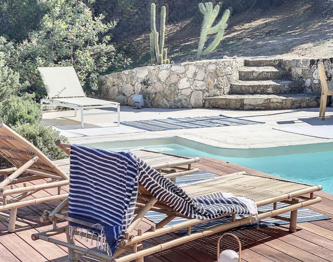 Très jolie villa avec piscine privée située sur une propriété surplombant la plage de bodri, au loin les Agriates et le cap Corse.