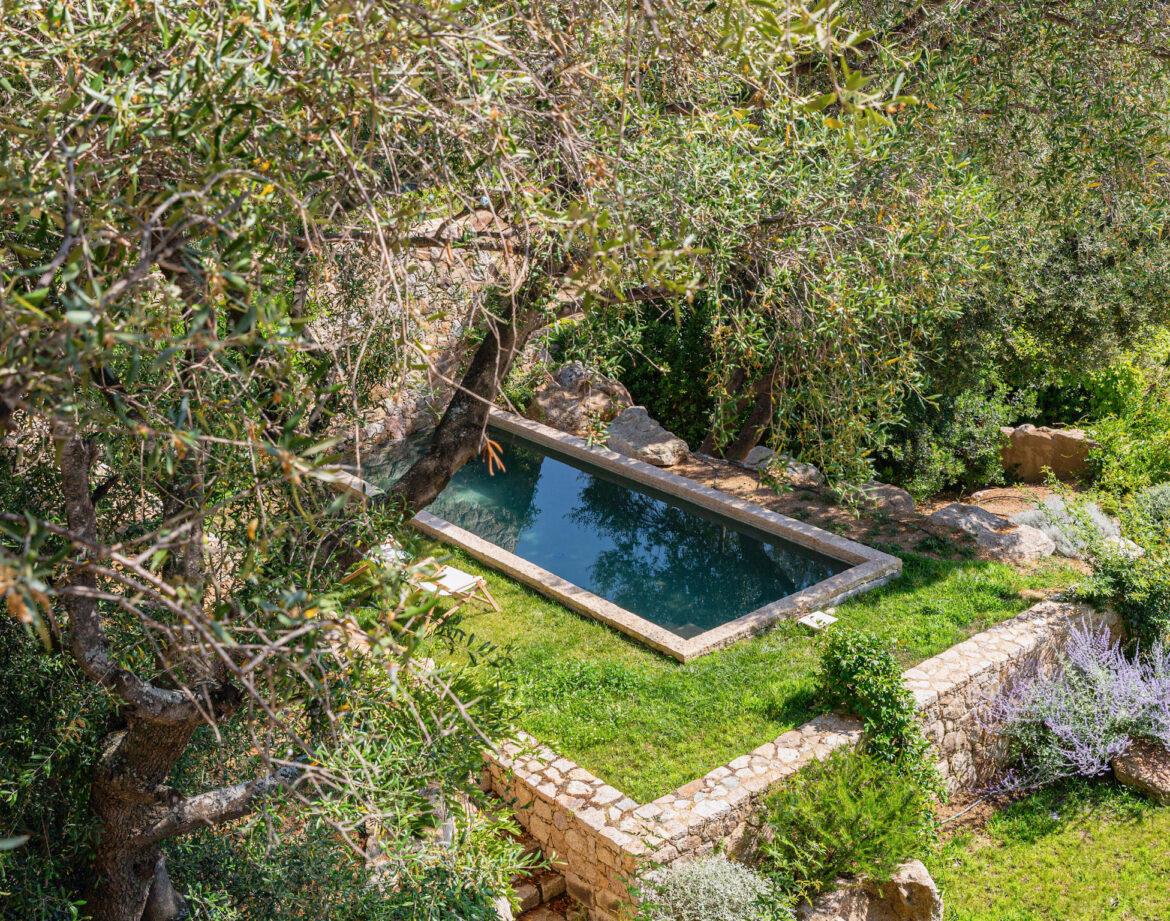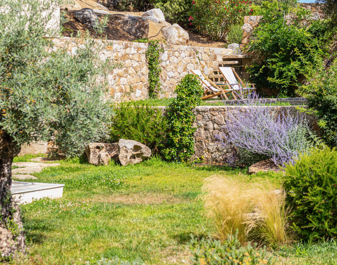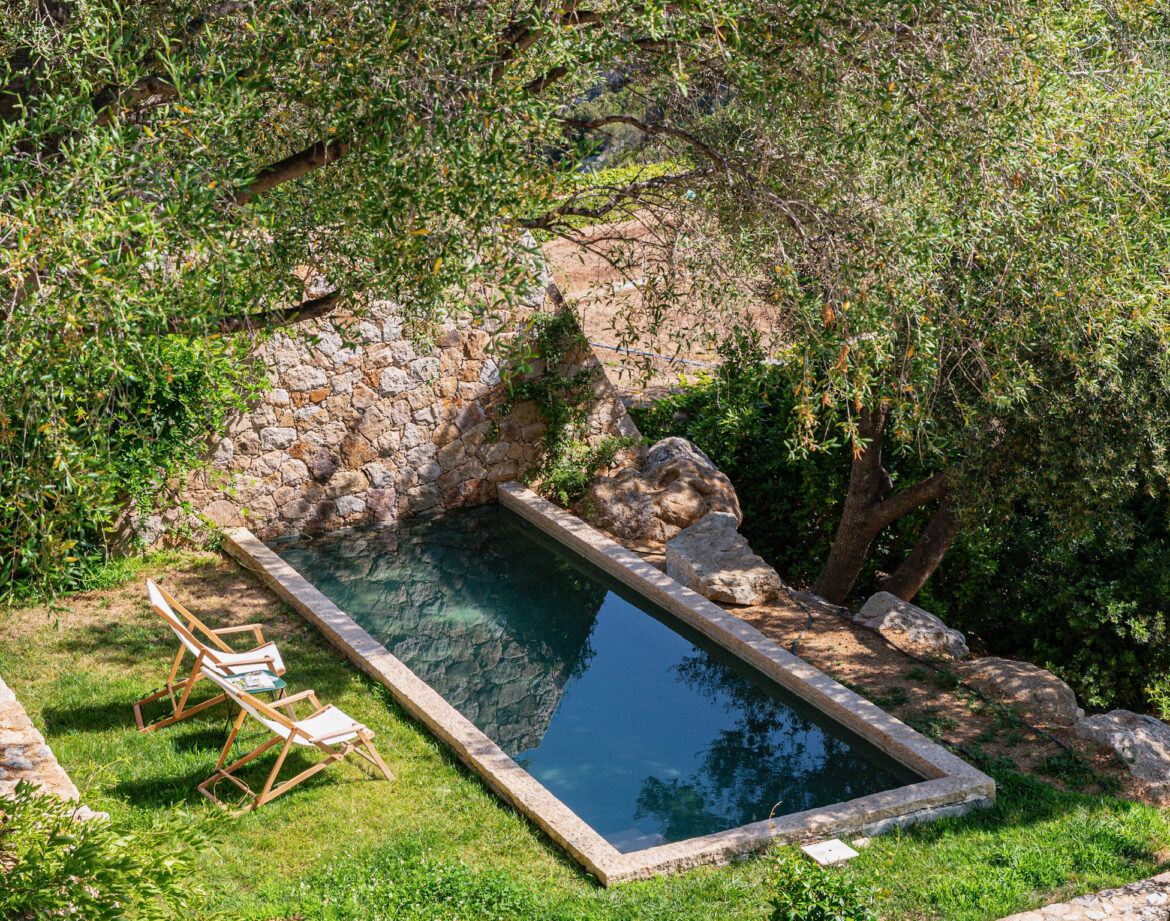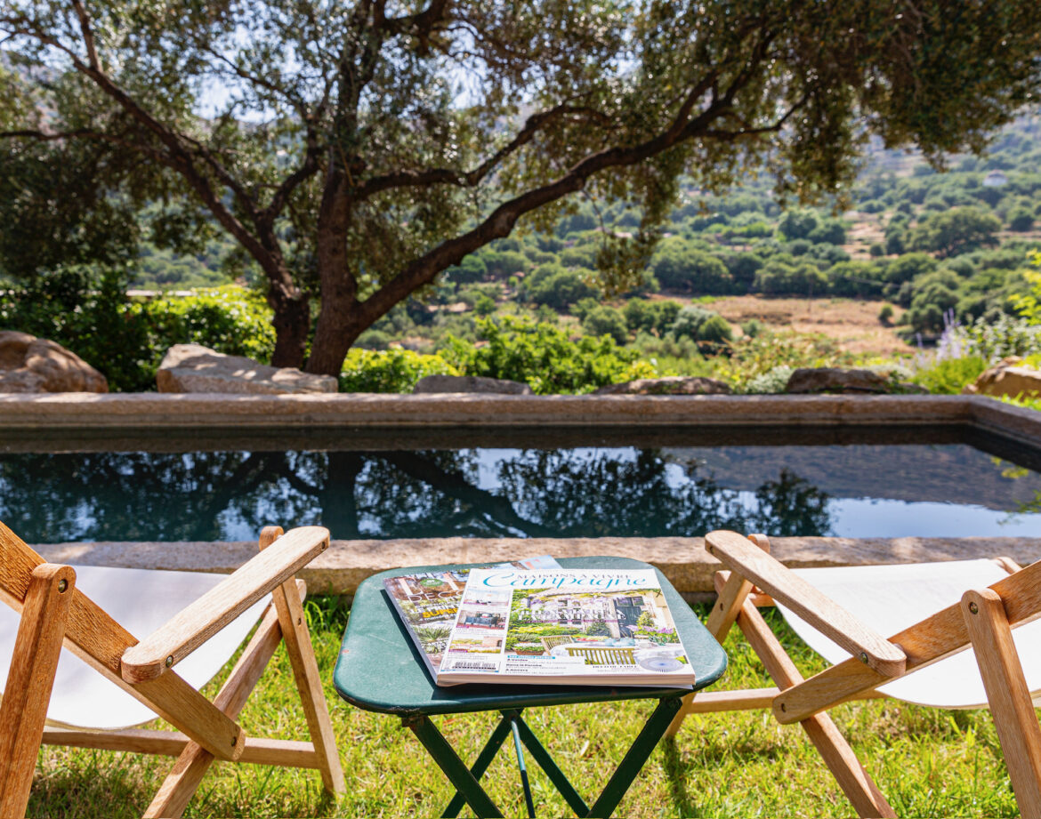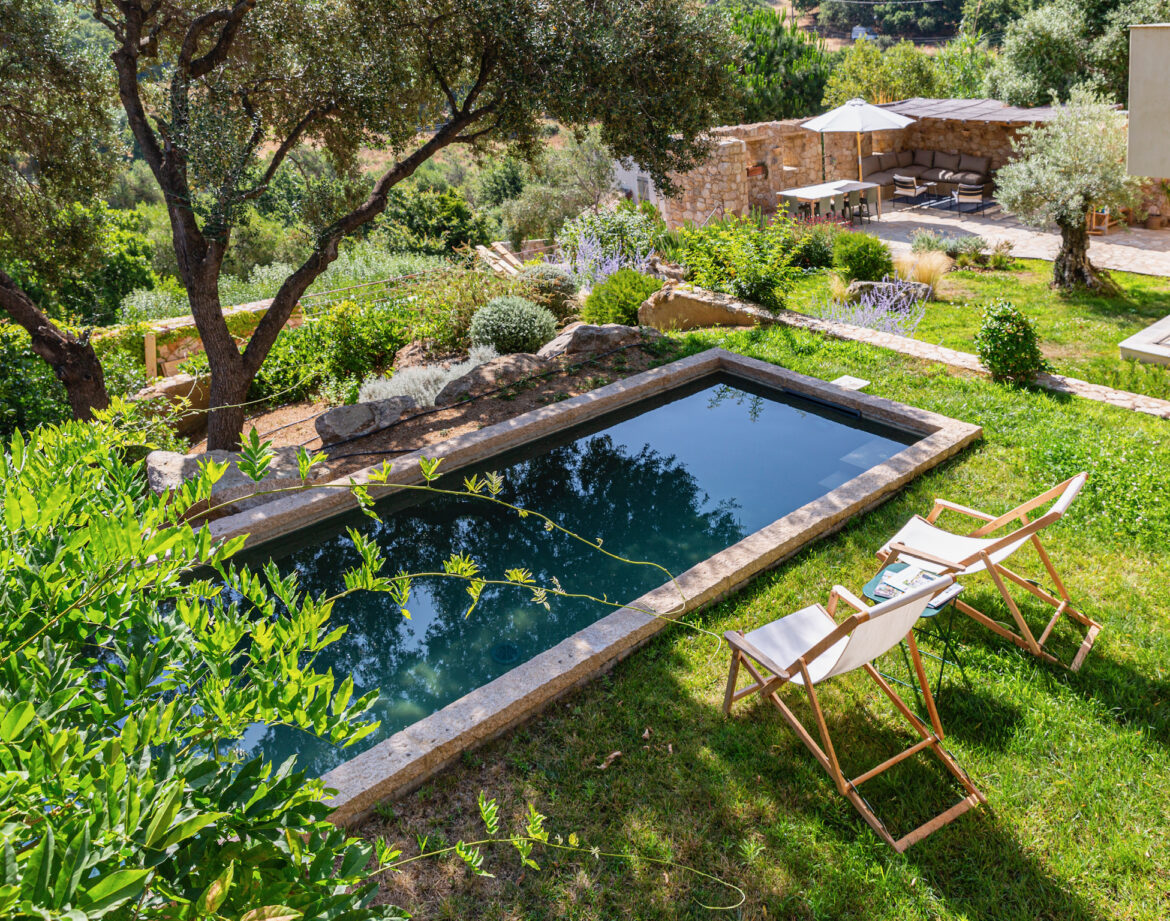 quelques marches plus haut dans le jardin, la piscine et ses quelques transats