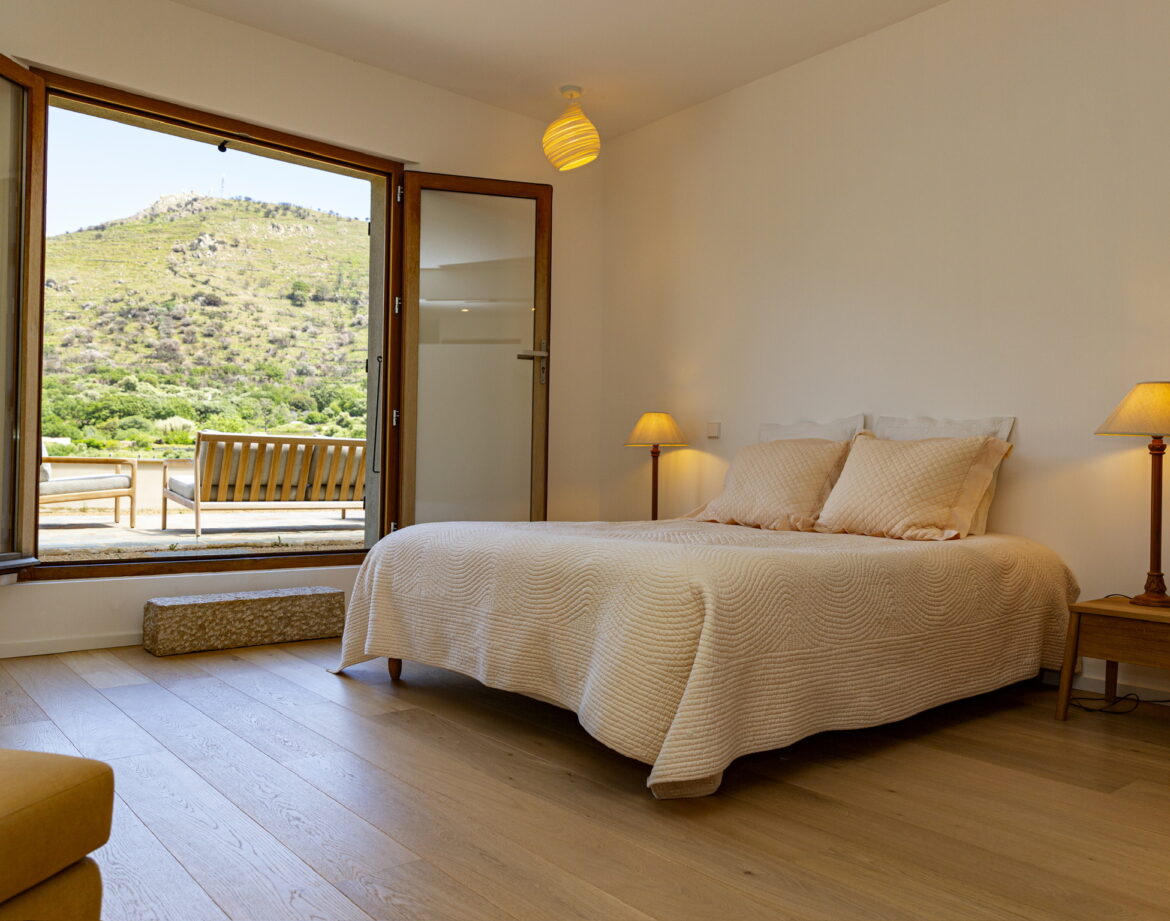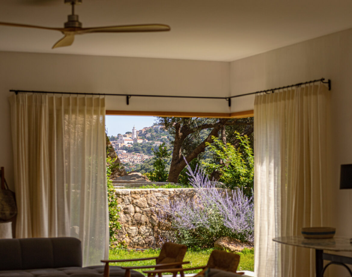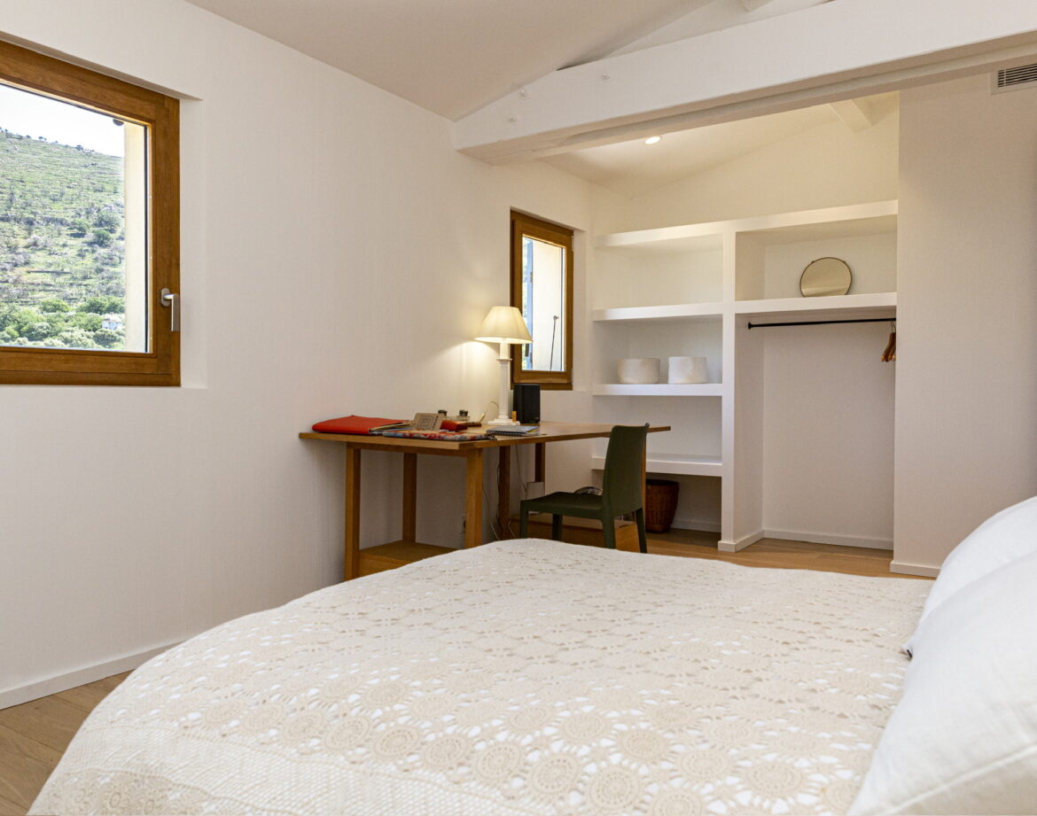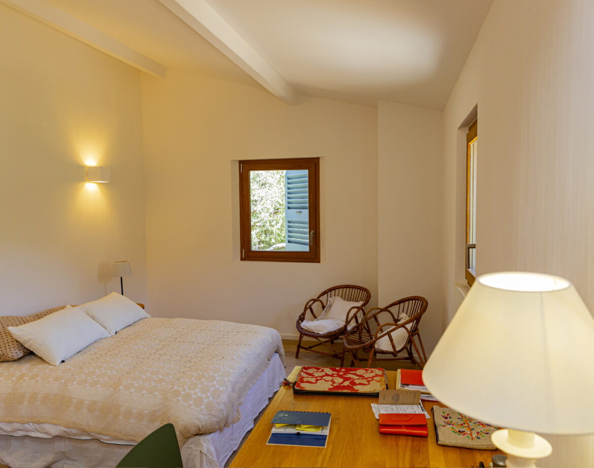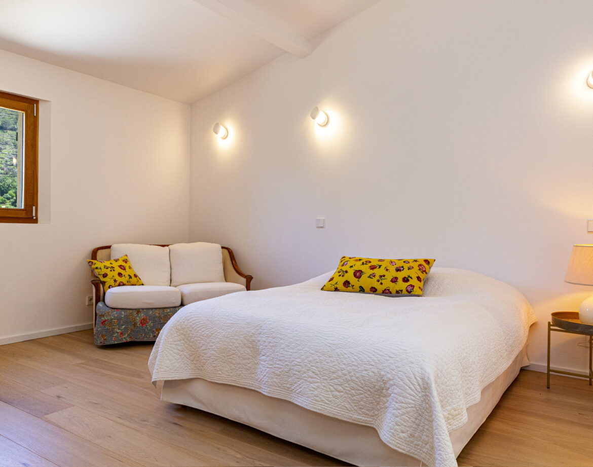 – 2 chambres (lit 160) avec chacune sa salle d’eau privative et wc, climatisée, sortant sur une belle terrasse extérieure vue sur le village de Corbara et le couvent au loin (avec salon de jardin).