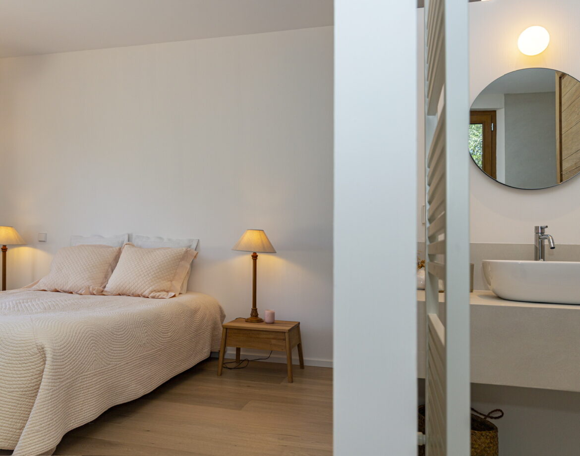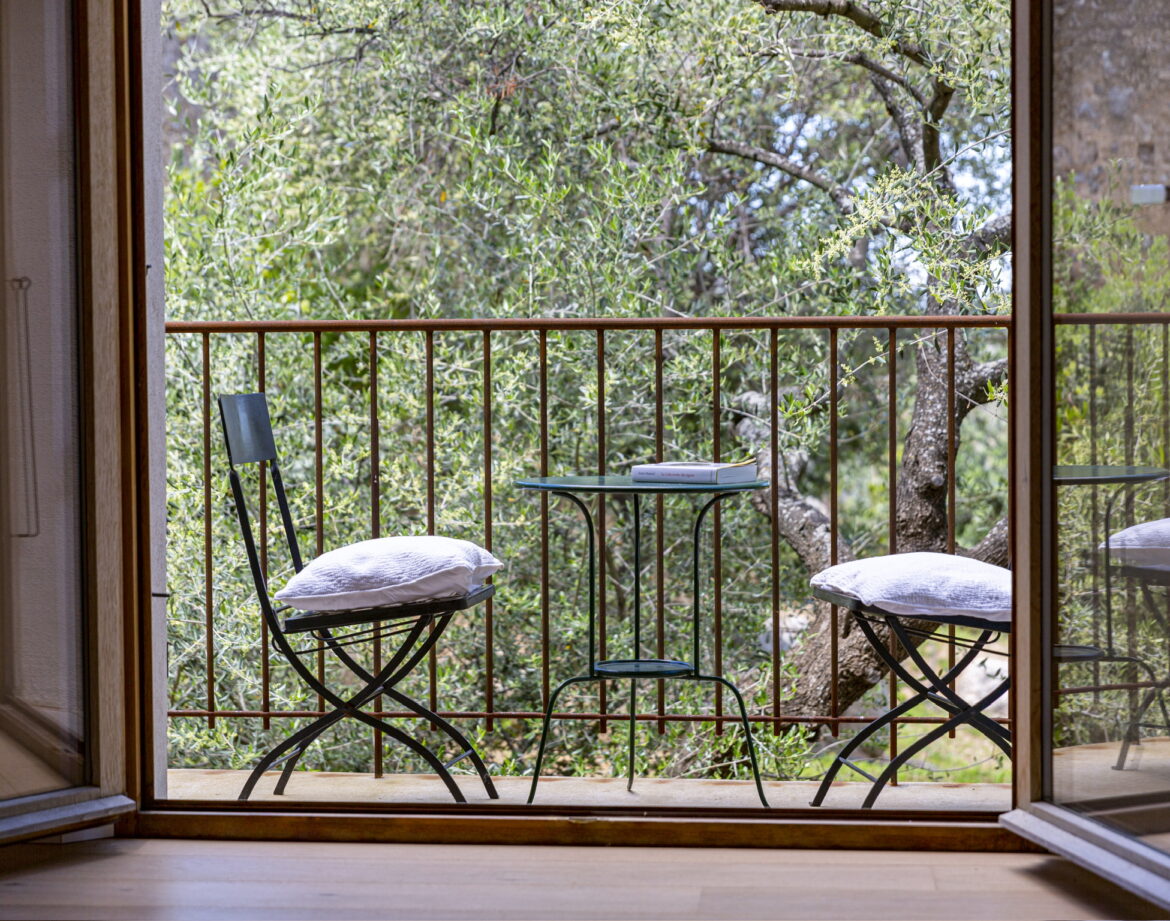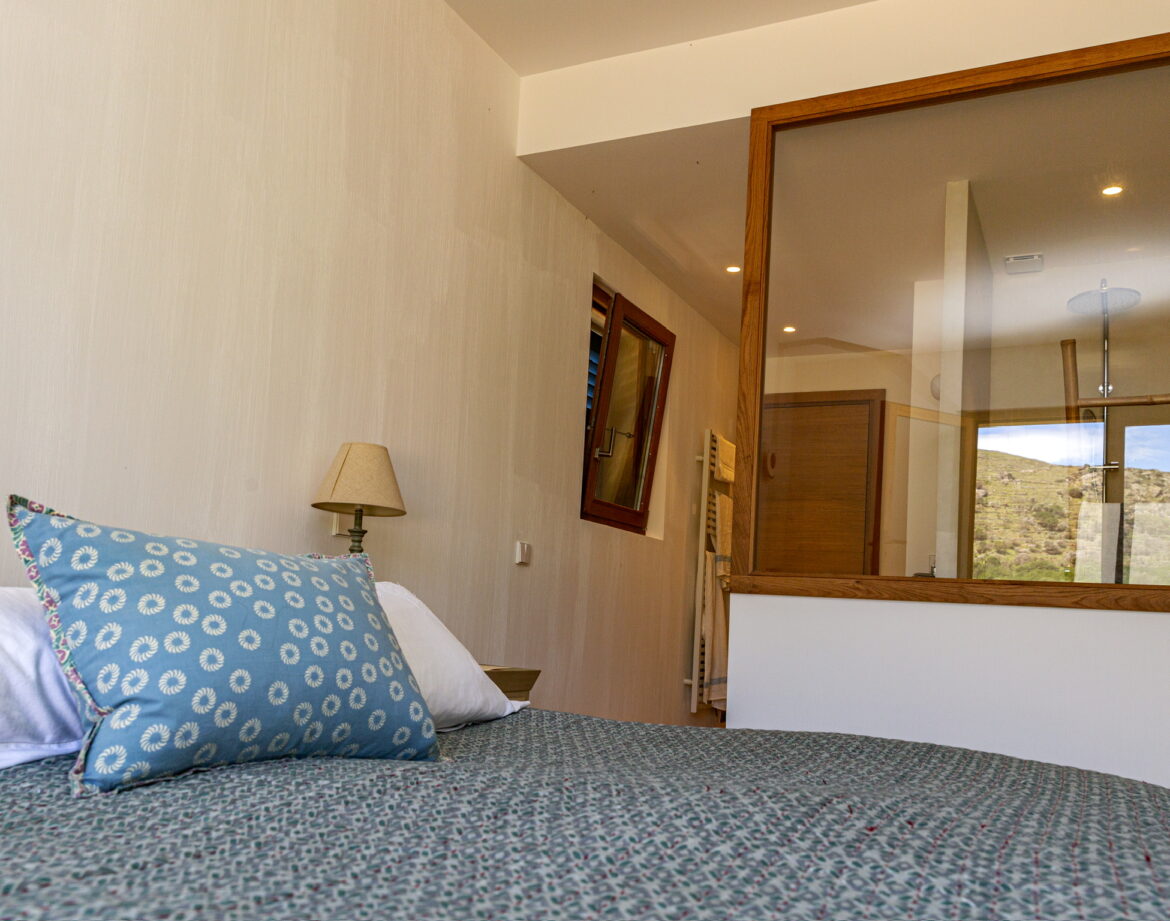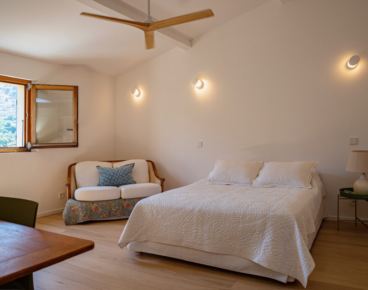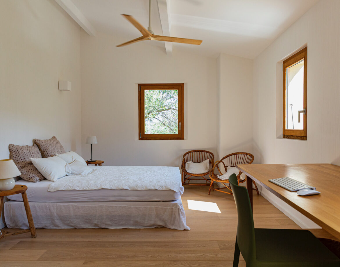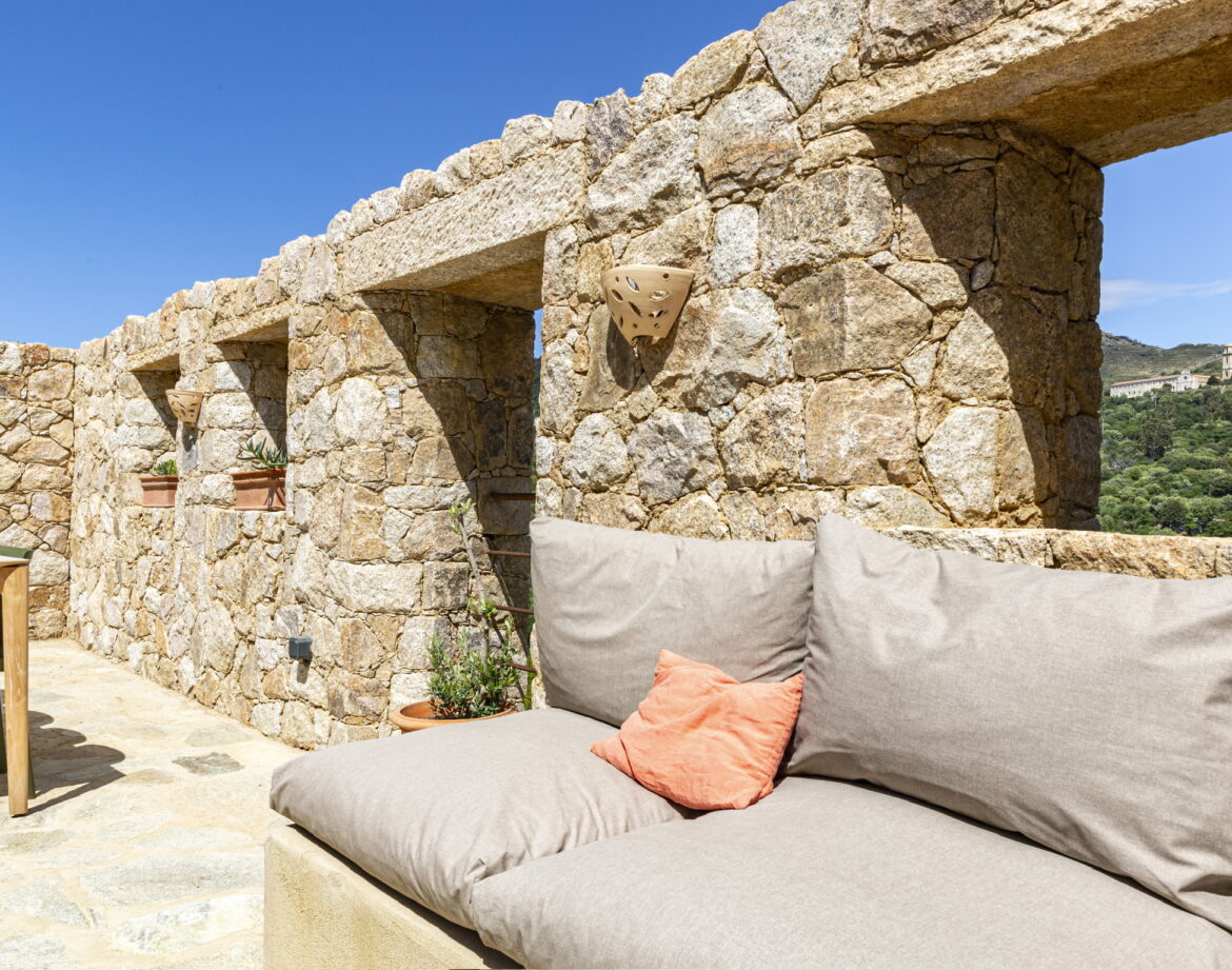 – 2 chambres (lit 160) avec chacune sa salle d’eau privative et wc, climatisée, sortant sur une belle terrasse extérieure vue sur le village de Corbara et le couvent au loin (avec salon de jardin).