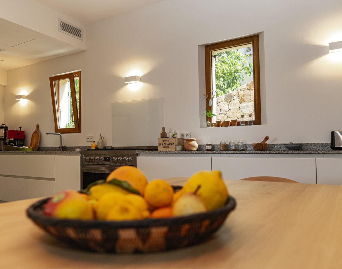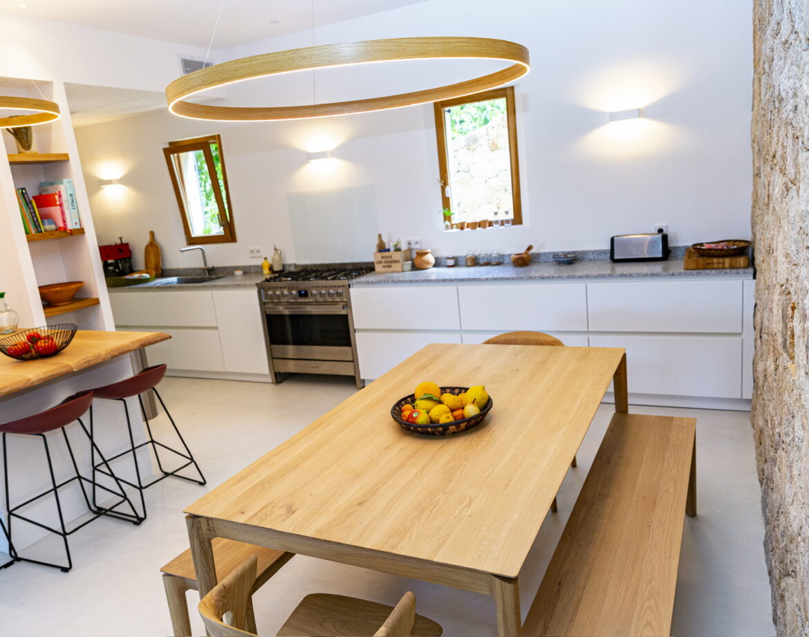 – la cuisine ouverte sur le salon/séjour, totalement équipée ( une grande table pour 10 à 12 convives, réfrigérateur/congélateur, piano de cuisson four et plaque à gaz, cafetière …)