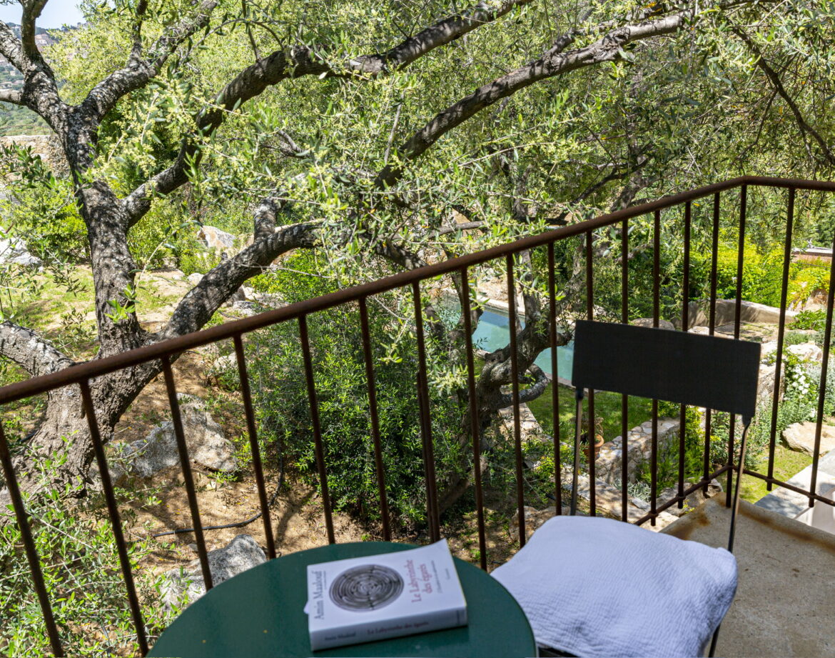 – un petit salon avec un grand écran et son balcon pour un café avec une vue superbe sur les collines environnantes, le jardin et la piscine et au loin le village de Corbara