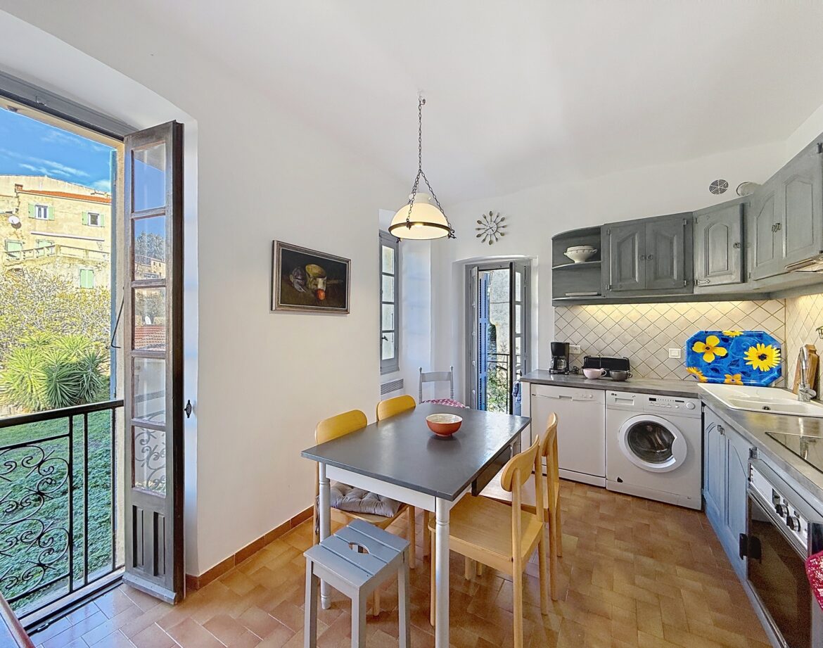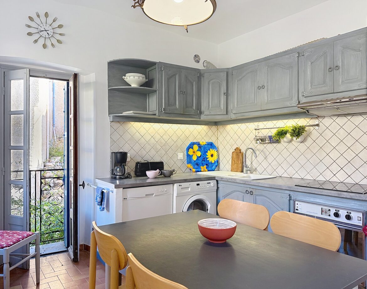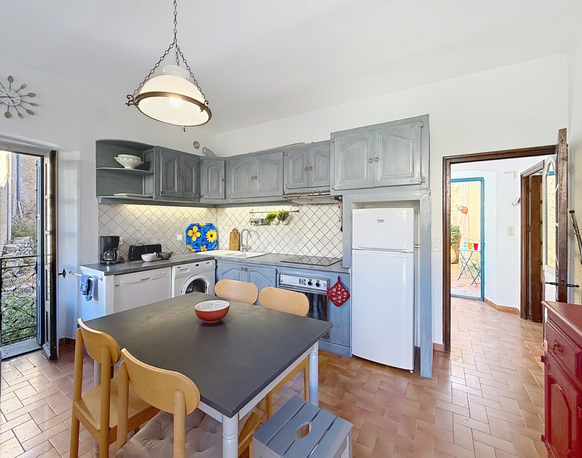 La cuisine est équipée, d’un réfrigérateur/congélateur, plaque de cuisson, d’une cafetière Nespresso, micro-onde, lave-vaisselle, lave-linge, et d’une table pouvant accueillir 4 à 6 personnes.