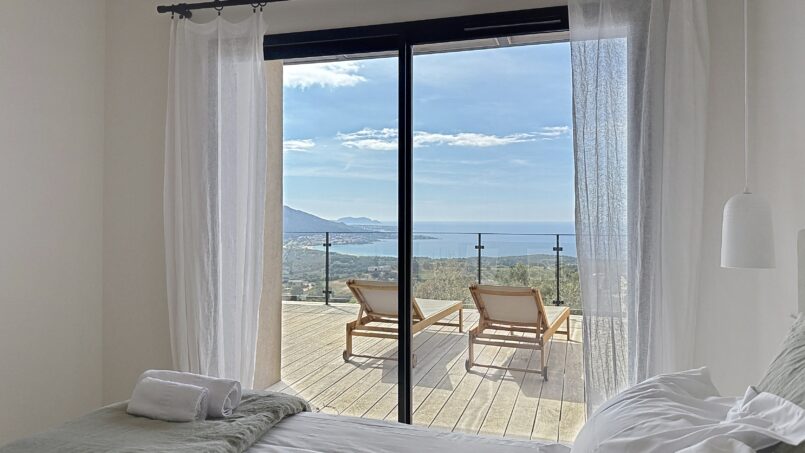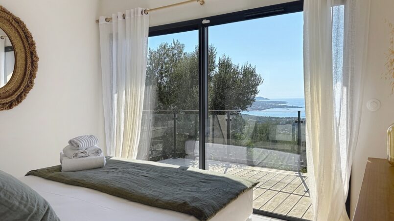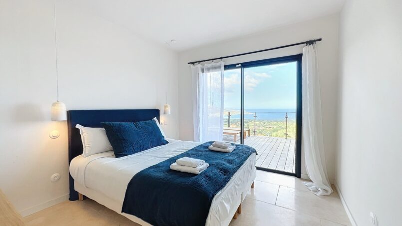 La villa Casa di C a 4 belles chambres, toutes vue mer et ouvrant sur l’extérieur, elle peut accueillir 8 personnes.
