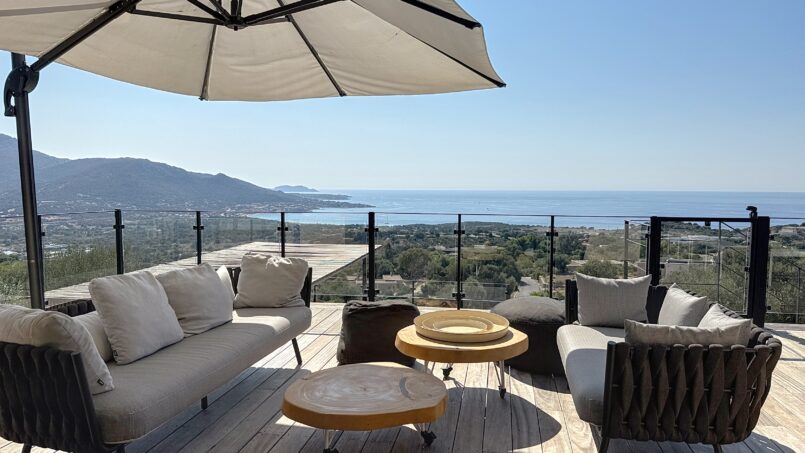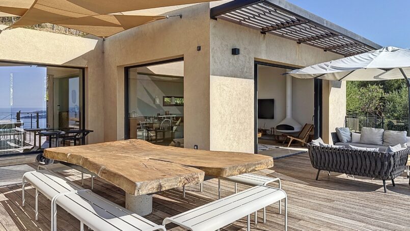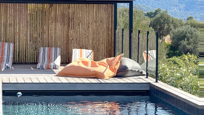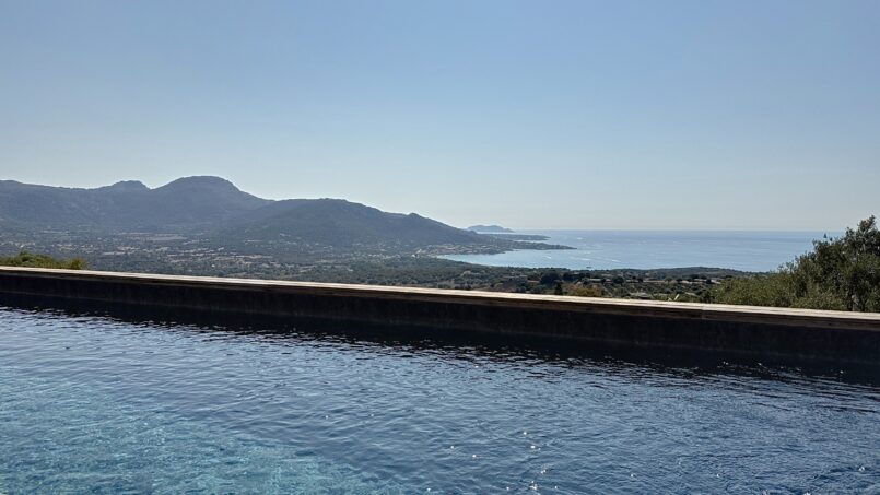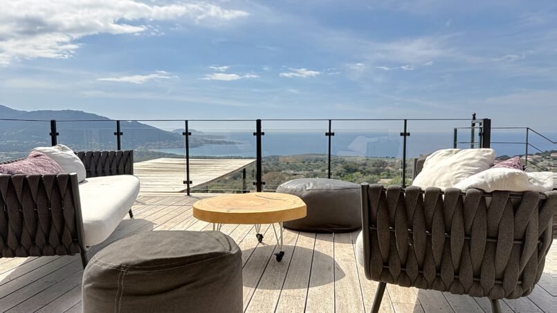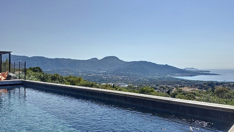 La piscine entourée d’un large deck est située quelques marches en dessous. De beaux espaces pour profiter de cette vue mer et montagne. A l’arrière de la villa un terrain de pétanque y est aménagé.