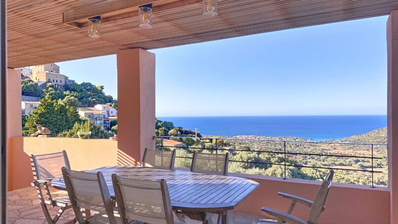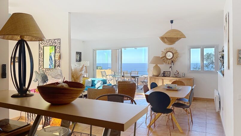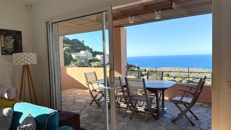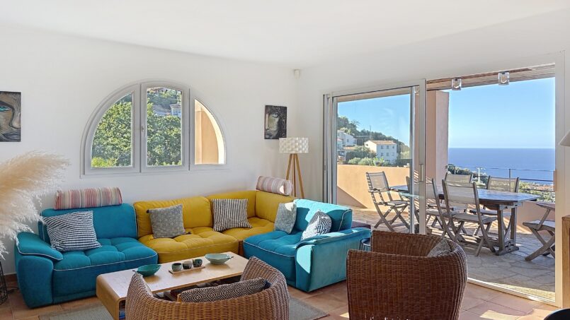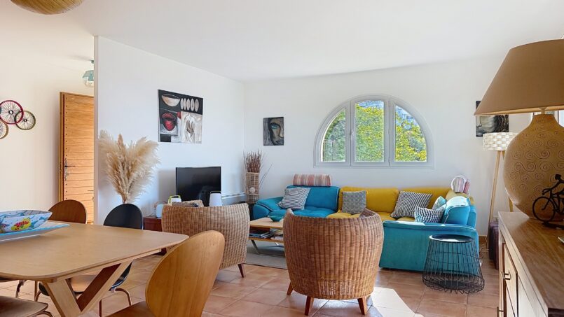 – un large séjour (canapé / TV) ouvrant sur une terrasse sous pergola vue mer et village.